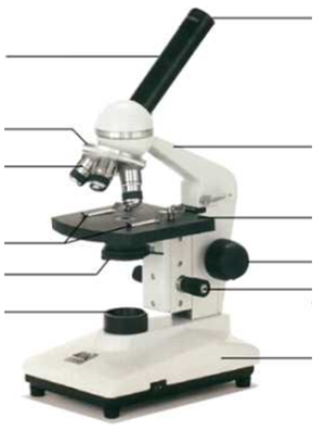 1 – негізі ( подставка); 2 – тубустың негізі; 3 – тубус; 4 – макрометрикалық винт; 5 – микрометрикалық винт; 6 – объекттерді бекітетін ұяшығы бар револьвер; 7 – қозғалғыш үстелше; 8 – қозғалғыш үстелшеде препаратты ұстап тұратын шығыршық (клеммы); 9 – айна; 10 – жарық көзі – конденсор, астында иристі диафрагма бекітілген.