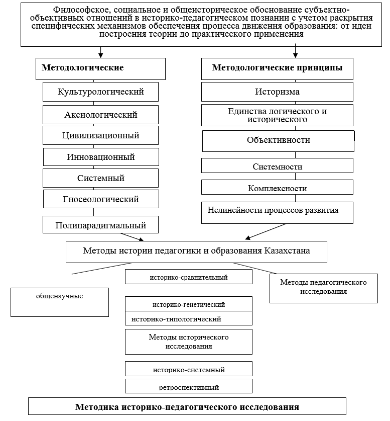 История педагогики и образования в Казахстане как отрасль науки имеет свою методологию как совокупность методов и средств, применяемых в диалектической взаимосвязи с философскими и общенаучными методами, которые ориентированы на анализ особенностей структур и развития образования.